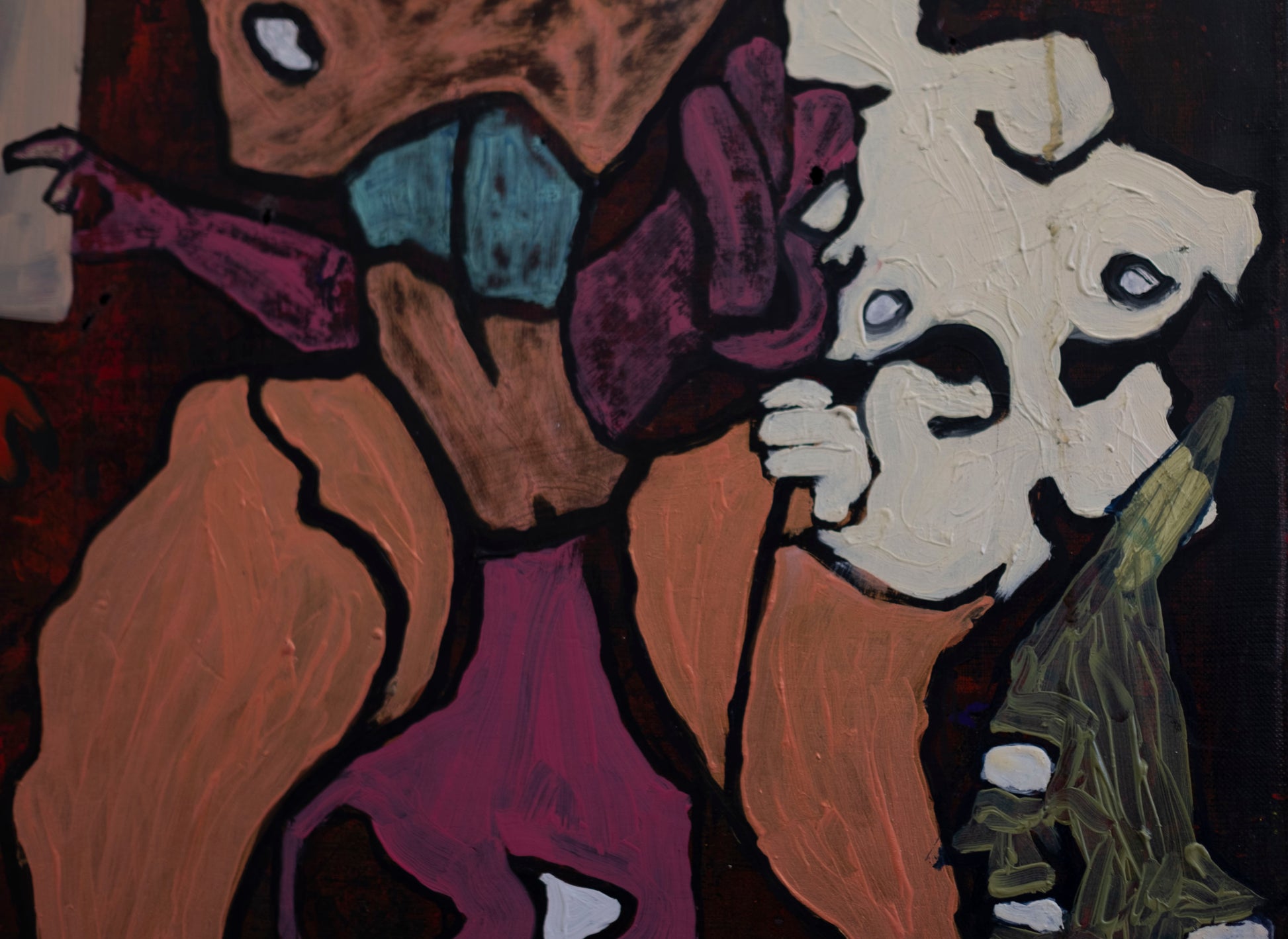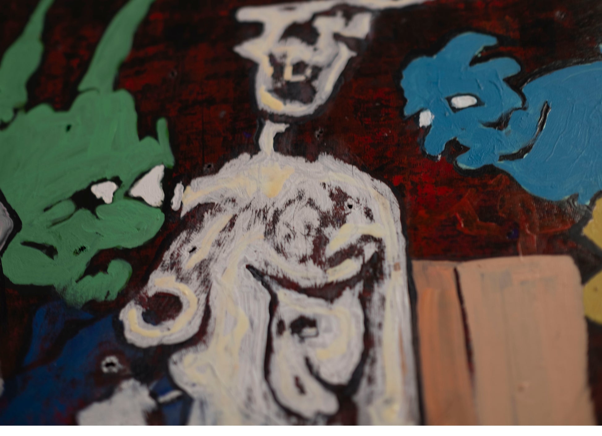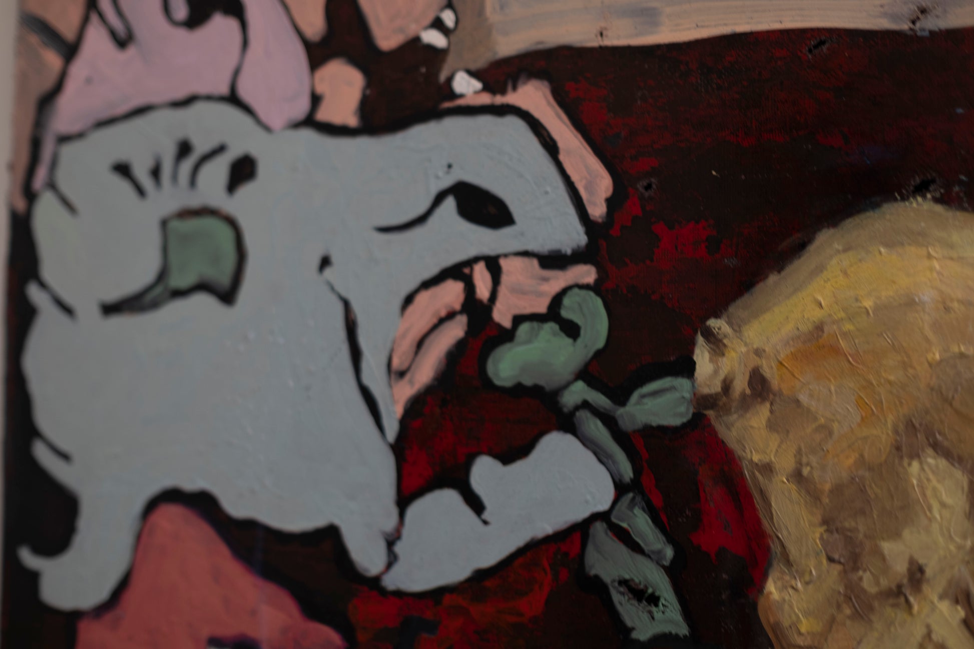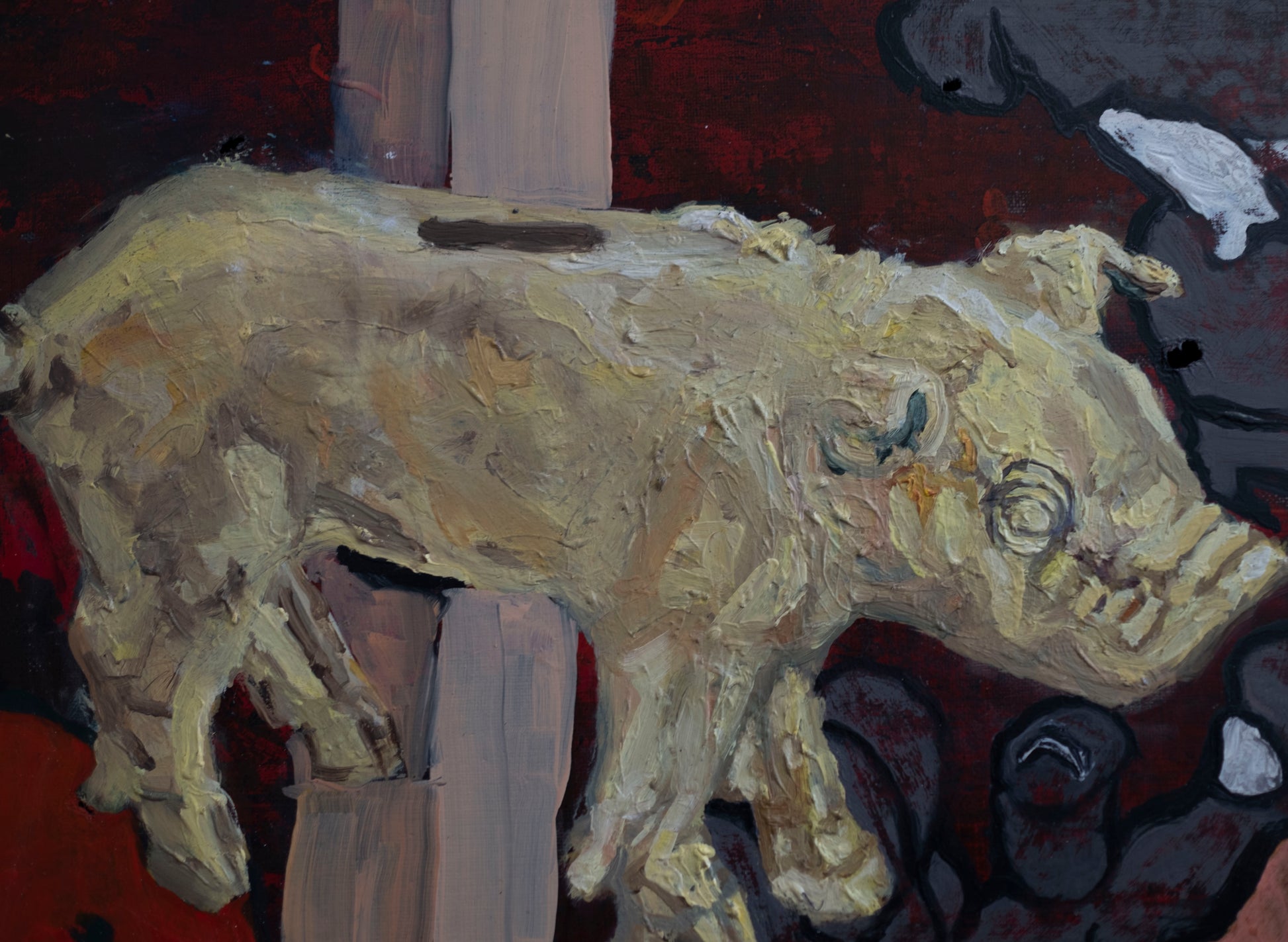 El animal dorado, situado justo en el cruce de los brazos de la cruz, atrae la atención como figura central, pero no necesariamente como protagonista. Su textura más densa y brillante contrasta con las zonas planas que lo rodean. La obra en su conjunto parece funcionar como una especie de altar caótico, donde lo sagrado y lo monstruoso coexisten, se enfrentan o se confunden.