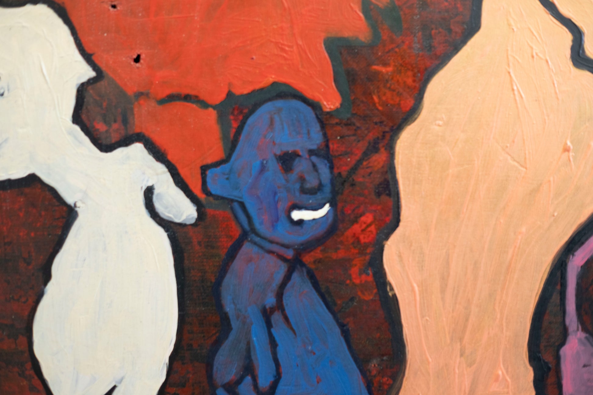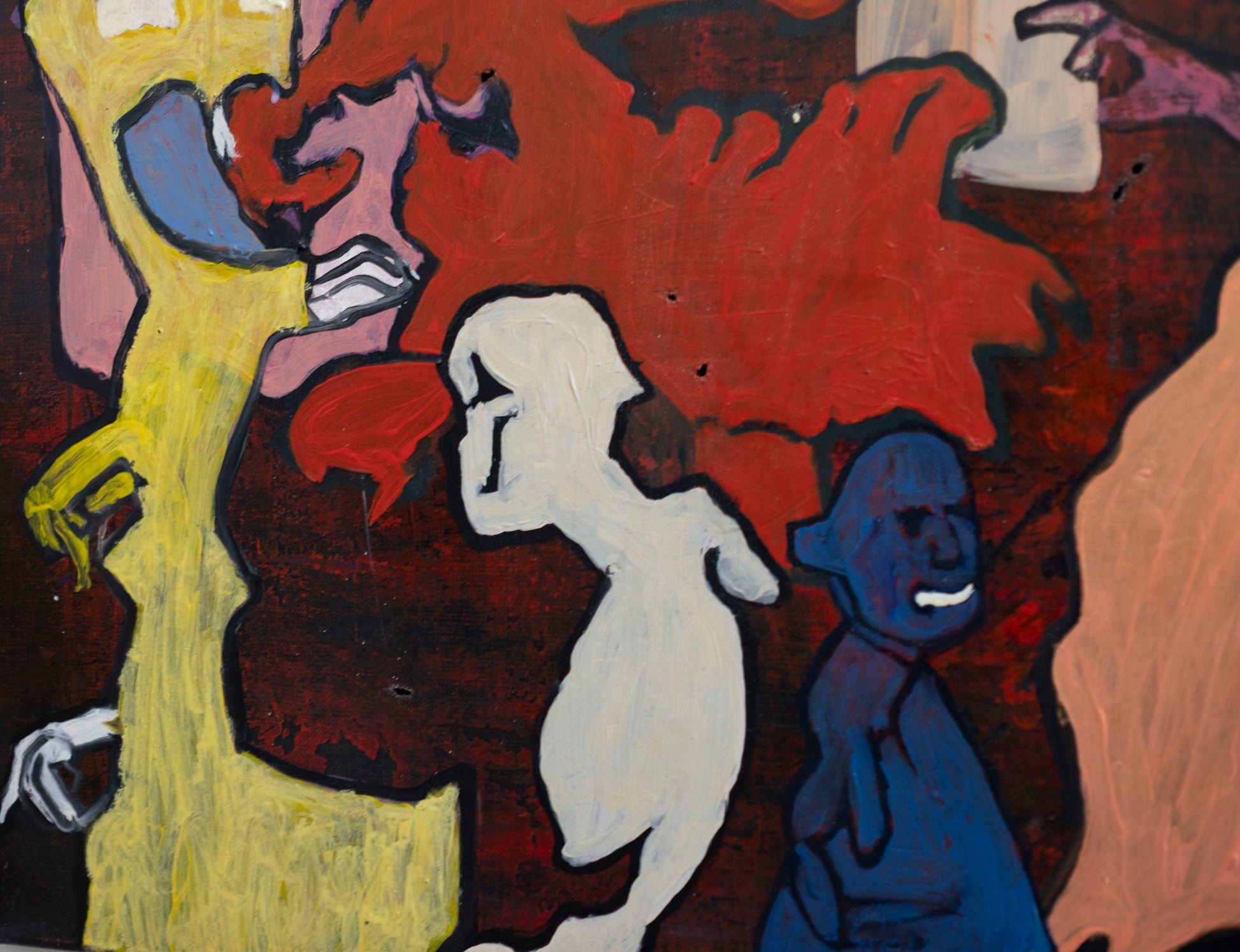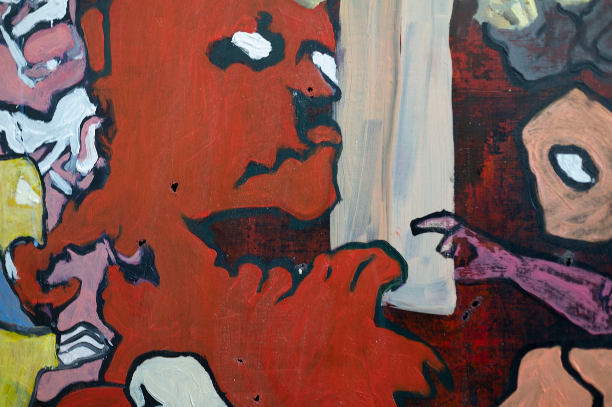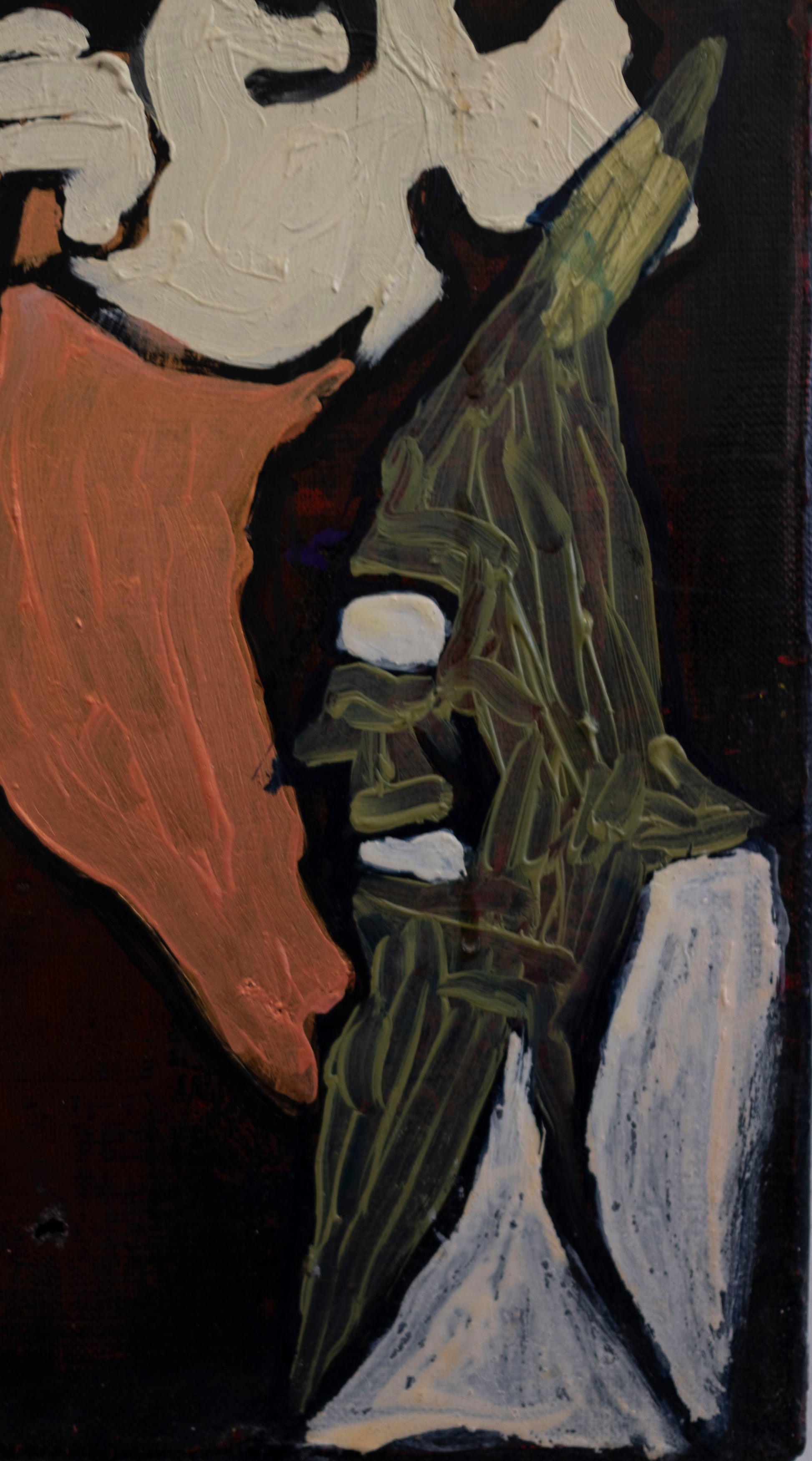 El animal dorado, situado justo en el cruce de los brazos de la cruz, atrae la atención como figura central, pero no necesariamente como protagonista. Su textura más densa y brillante contrasta con las zonas planas que lo rodean. La obra en su conjunto parece funcionar como una especie de altar caótico, donde lo sagrado y lo monstruoso coexisten, se enfrentan o se confunden.