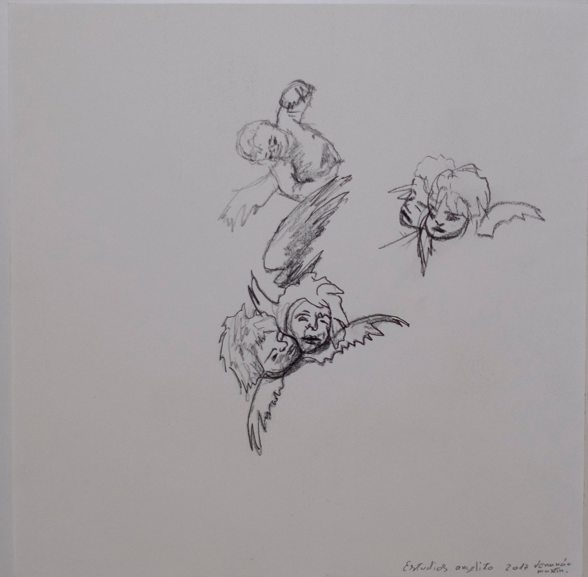 Este estudio me permitió explorar la forma y el gesto sin comprometerme con una narrativa cerrada. Los angelitos, figuras cargadas de simbolismo, se convierten aquí en ejercicios de mirada y síntesis. Me interesa esa tensión entre lo reconocible y lo informal, entre lo que se sostiene y lo que apenas aparece.