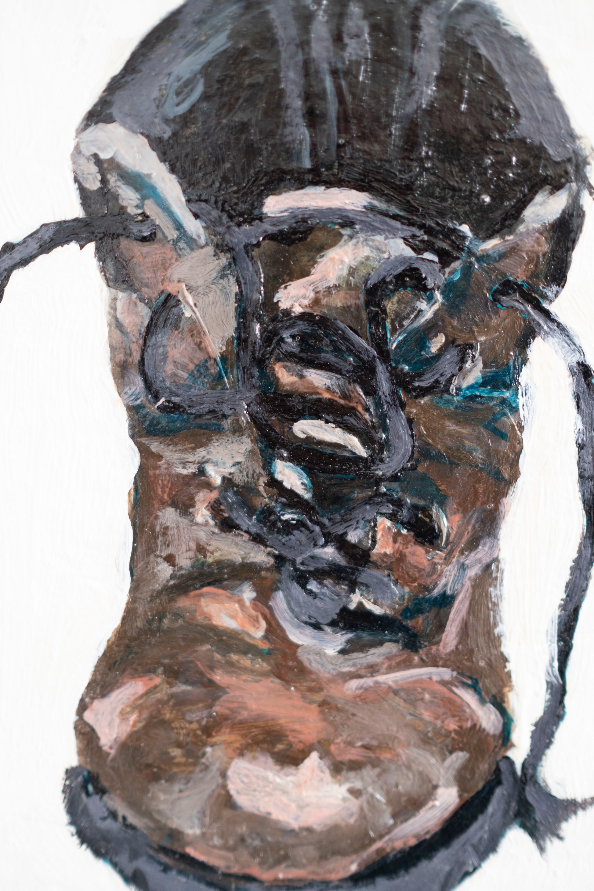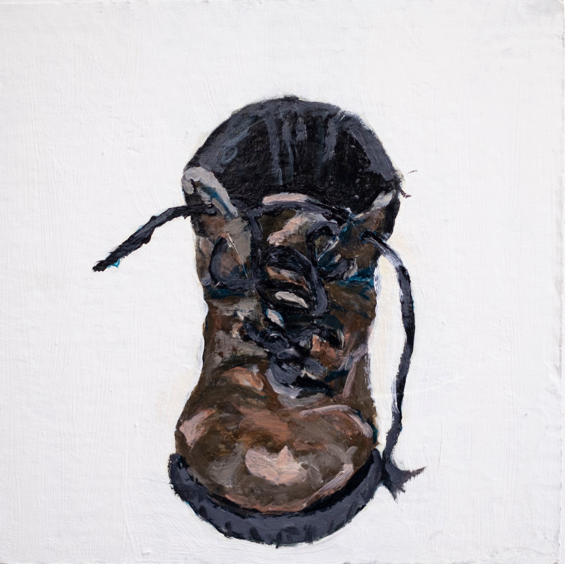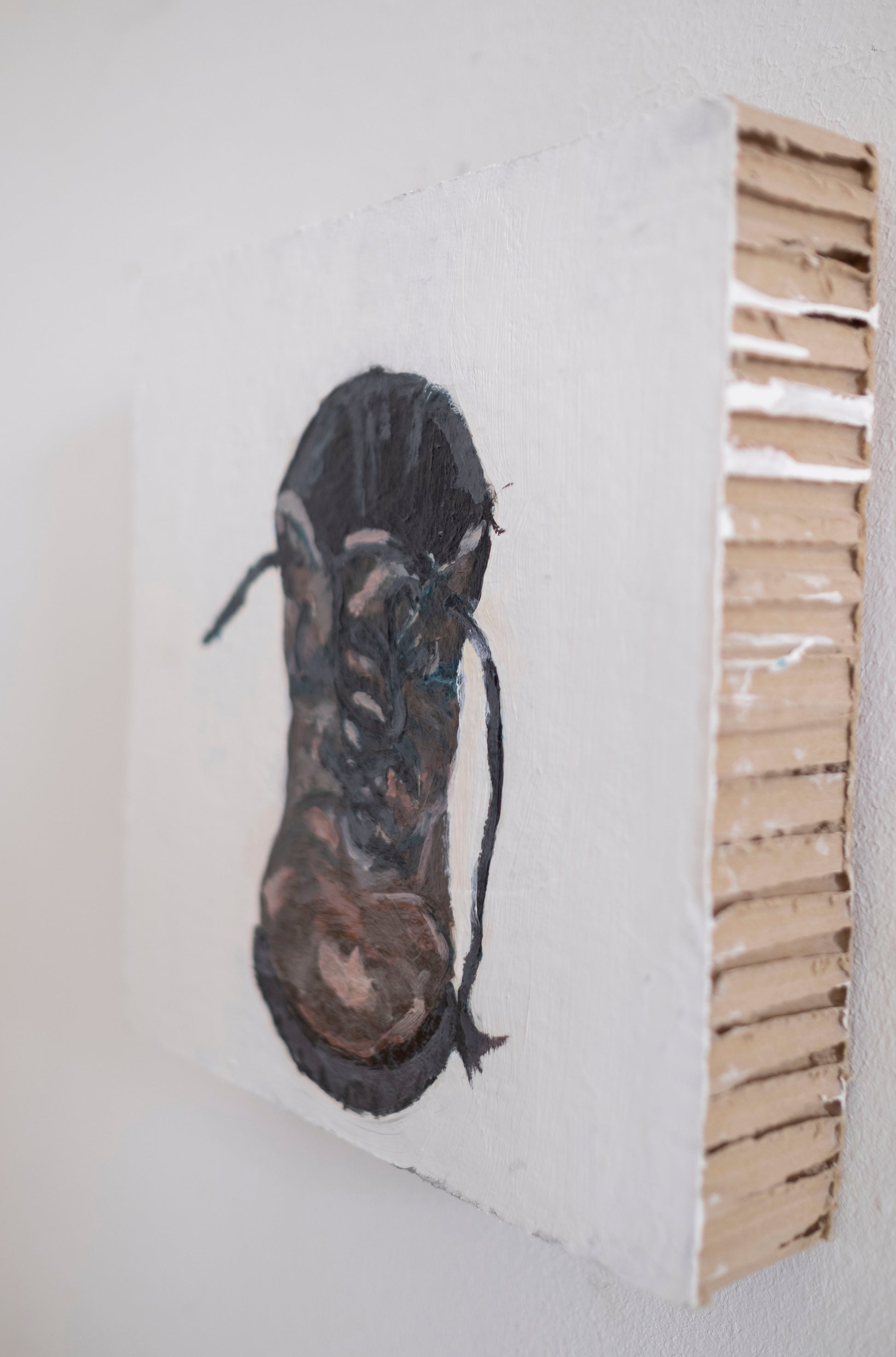 El encuadre frontal y centrado otorga a la bota una fuerza visual inmediata. La pincelada es densa y suelta, con toques de color que revelan el cuero desgastado, la suciedad acumulada, los cordones deshechos. El fondo blanco neutro contrasta con la materia pictórica del objeto, separándolo del tiempo y del espacio narrativo, y colocándolo casi como una reliquia. La textura del cartón nido de abeja añade una vibración material que refuerza la fisicidad de la obra. La ausencia de elementos adicionales intensifica el carácter contemplativo y escultórico del conjunto.