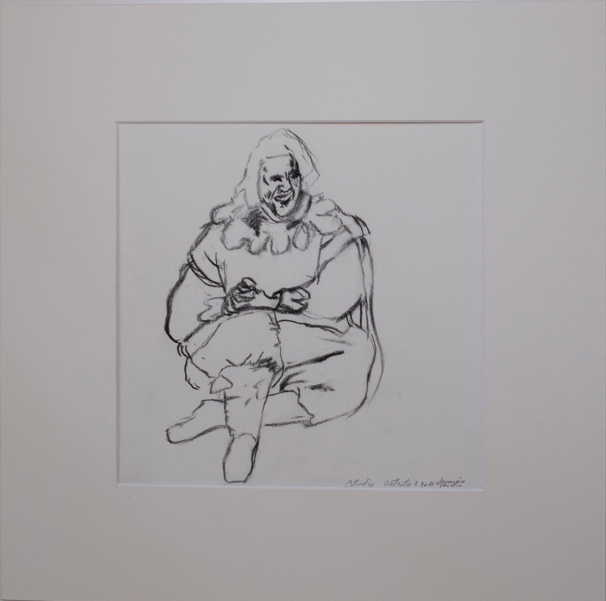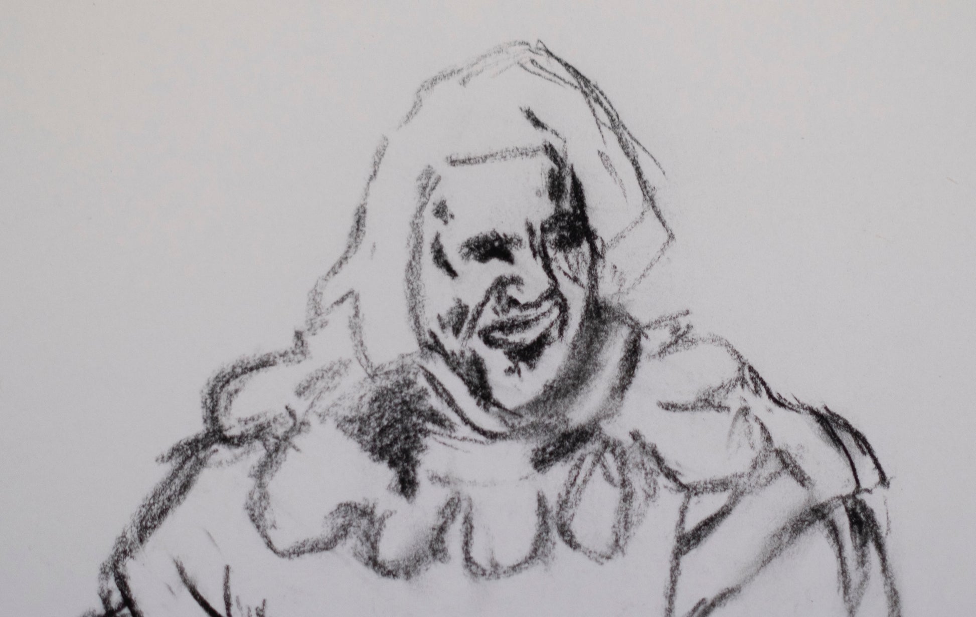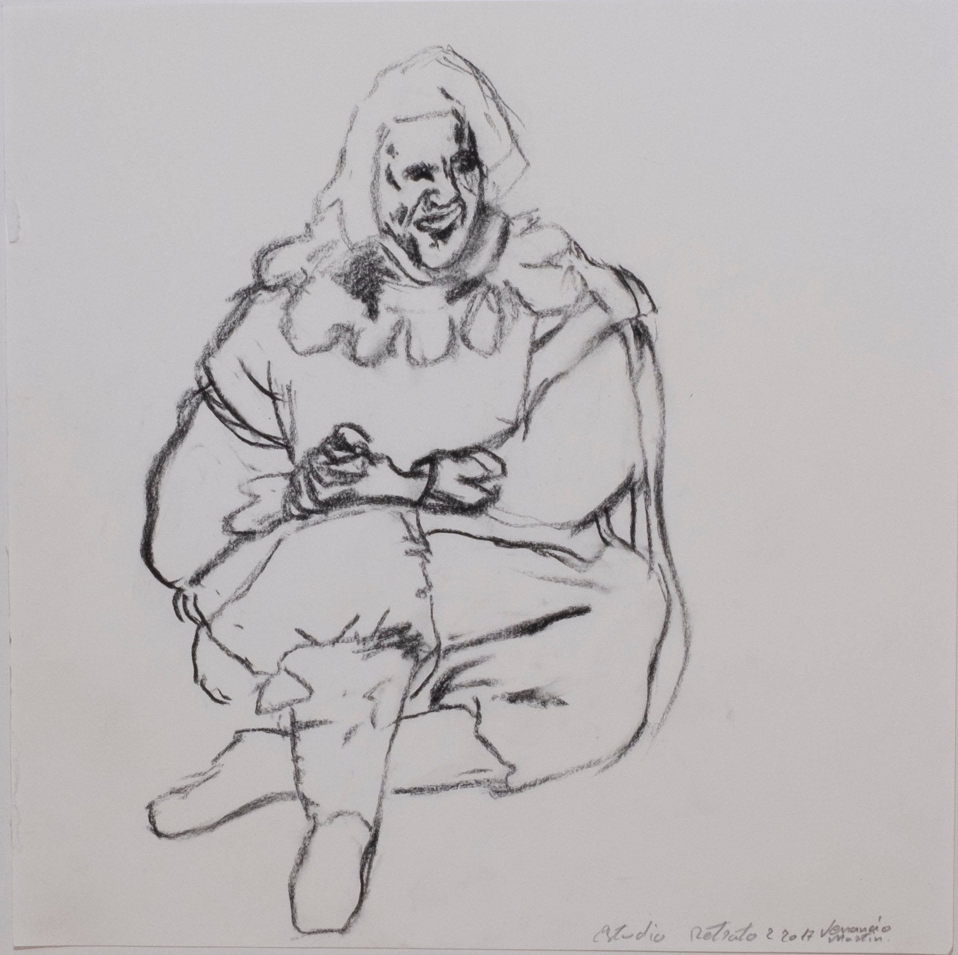 El uso de carboncillo para este dibujo permite una gran flexibilidad en la representación del volumen, lo que otorga una sensación de dinamismo al cuerpo del bufón. Los contornos sin detalles innecesarios y el contraste entre la sombra y la luz provocan una lectura visual que enfatiza los gestos, en especial la expresión del rostro. La ausencia de un fondo complejo permite que el personaje sea el centro de atención, destacando su postura relajada y el ambiente de juego en su figura. La elección de este tipo de estudio, sin un exceso de detalles, refleja la intención del autor de mostrar la autenticidad del momento de observación, capturando más el "sentir" que el "representar".