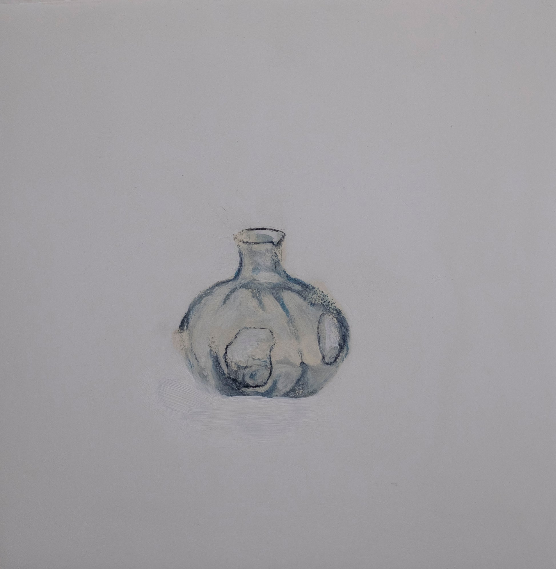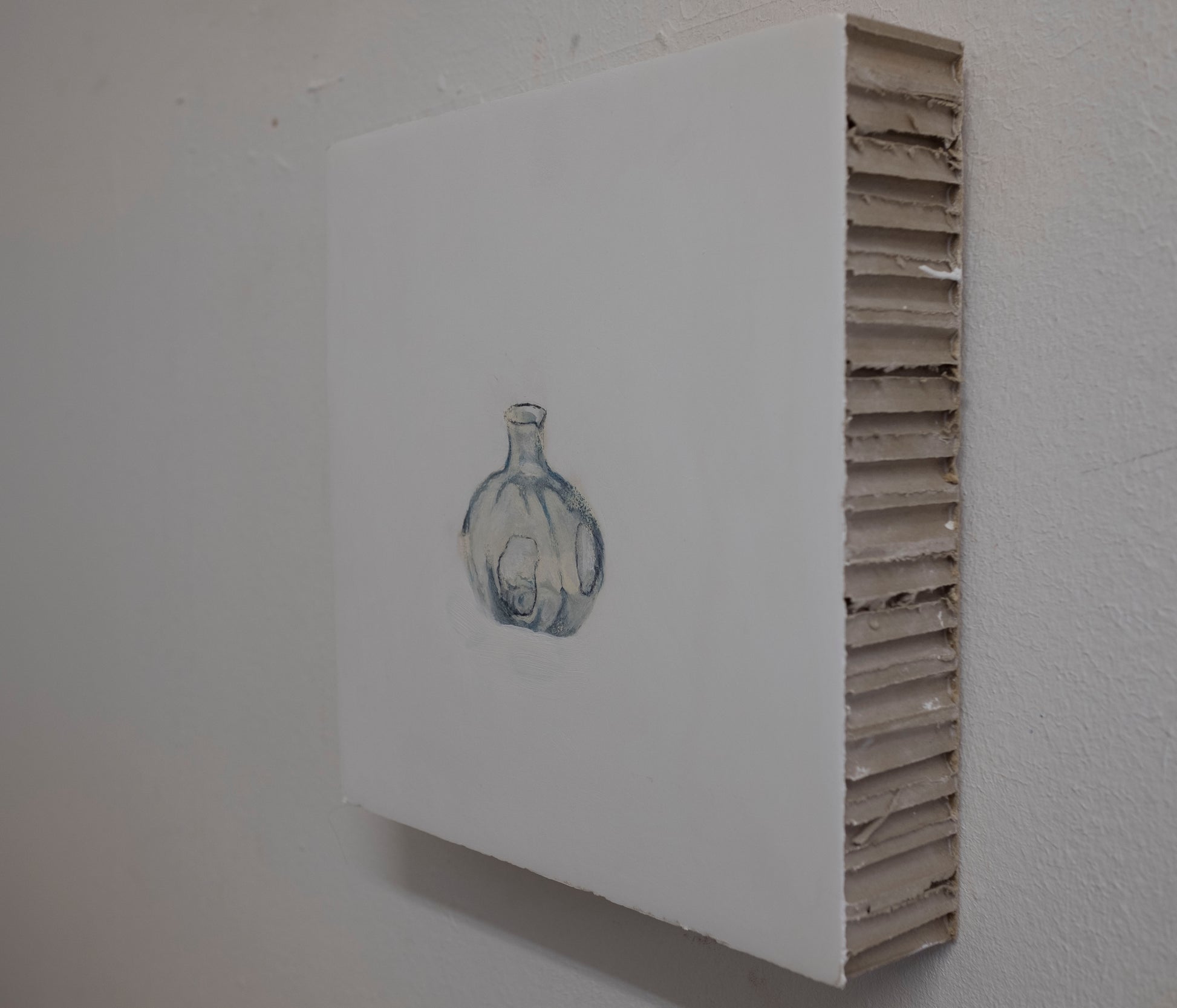En esta pieza, el fragmento de cristal pintado adquiere la dimensión de un pequeño paisaje emocional. Las capas de óleo sobre acrílico logran captar no solo la transparencia delicada del vidrio, sino también las marcas profundas que el tiempo ha dejado en su superficie. La tensión visual generada entre la fragilidad del cristal y la robustez del soporte de cartón nido de abeja refuerza la narrativa de una belleza que surge precisamente del deterioro. Esta obra recuerda que en la ruina, y especialmente en la sutileza del daño, hay historias silenciosas esperando ser descubiertas.