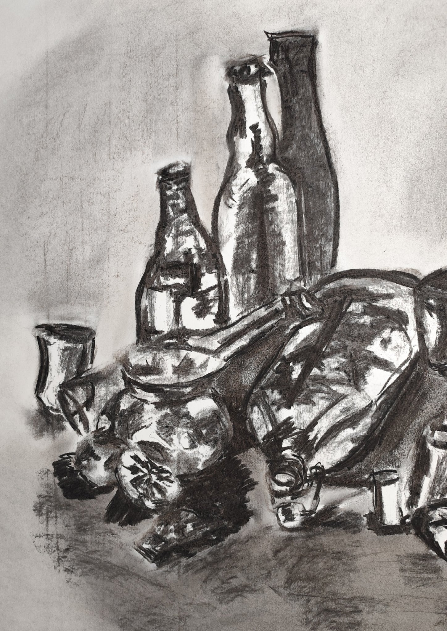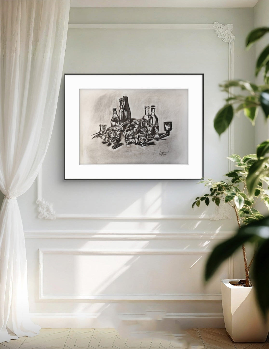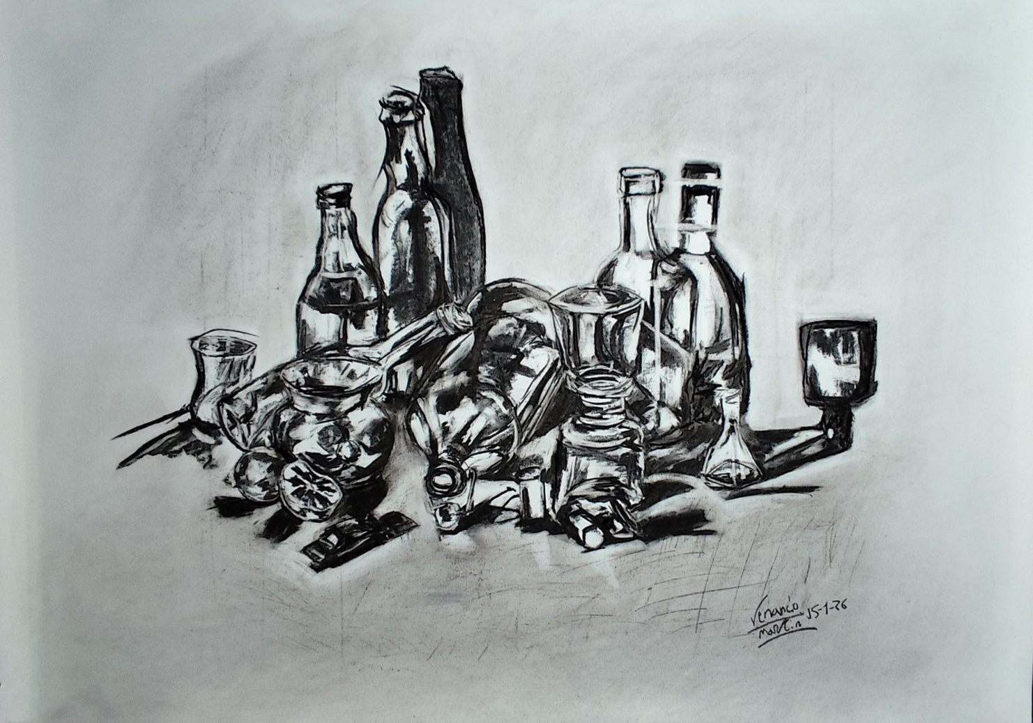 Dibujo construido desde la estructura, el peso y la organización espacial de las formas. Los objetos se presentan como presencias físicas, no como elementos descriptivos. El equilibrio es inestable y el vacío actúa como fuerza activa dentro de la composición.